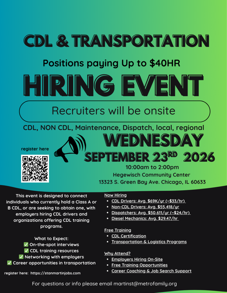 Are you ready to launch a rewarding career in the transportation industry? Join us on Wednesday, September 23, 2026, from 10:00 AM to 2:00 PM at the Hegewisch Community Service Center, 13323 S. Green Bay Ave., Chicago, IL 60633, for our CDL & Transportation Hiring Event! This event brings together top employers, training providers, and jobseekers pursuing opportunities in commercial driving and transportation careers.